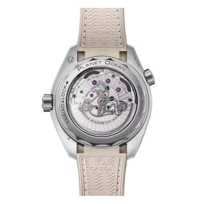 Diese Seamaster Planet Ocean, die vom Co-Axial Master Chronometer Kaliber 8900 angetrieben wird, ist mit einem integrierten beigefarbenen Kautschukarmband mit strukturiertem Muster und weißer Naht ausgestattet. Den NAIAD LOCK Gehäuseboden ziert ein metallisiertes Seepferdchen auf dem Saphirglas.