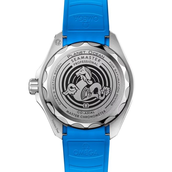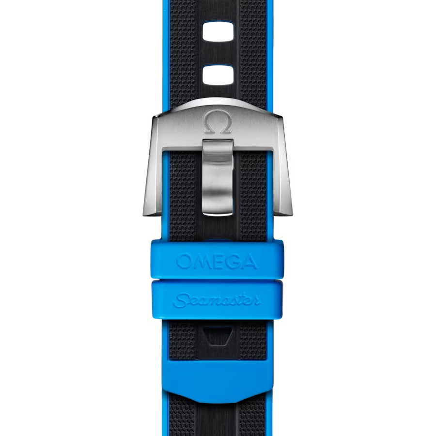 Die Uhr wird von einem Kautschukarmband mit cyanblauer Unterfütterung und O-MEGASTEEL Schließe am Handgelenk gehalten, während das Medaillon aus Titan Grade 5 auf dem Gehäuseboden per Laser mit einem Sonar-Symbol und dem ikonischen OMEGA Seepferdchen in der Mitte graviert wurde. Angetrieben wird die Uhr von dem OMEGA Co-Axial Master Chronometer Kaliber 8912.